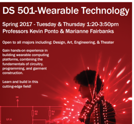 DS 501 Wearable Technology This class is meant to give students hands-on experience in building wearable computing platforms. Students will learn fundamentals of both AC and DC circuitry, weaving, basic […]
